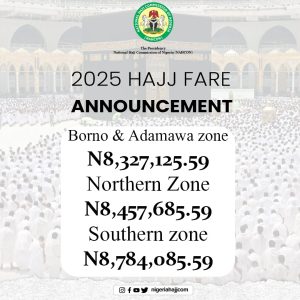 The statement read, “The 2025 Hajj fare for Borno and Adamawa zone’s intending pilgrims is N8.33 million. Similarly, the cost for intending pilgrims from the Southern states is N8.78 million, while pilgrims from the Northern zone will pay N8.46 million.