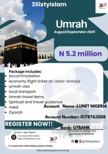 3SixtyIslam is a one stop home for everything Islamic, we handle your Hajj and umrah travels too.When next you are planning to go on hajj or umrah , 3SixtyIslam is your sure agent for convinient and affordable pilgrimage Faith. Fully Guided.For more details, please call or WhatsApp on +2348155577038 (‘Leke Yusuf)