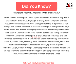 the time of the Prophet ṣallallāhu ‘alayhi wa sallam (peace and blessings of Allāh be upon him), each aspect to do with the rites of Hajj was in the hands of different sub-groups of the Quraish. Every one of these would eventually lose control of their guardianship of a particular rite except one. On the conquest of Makkah, the Prophet ṣallallāhu ‘alayhi wa sallam (peace and blessings of Allāh be upon him) was given the keys to the Kaaba and instead of keeping it in his own possession; he returned them back to the Osman ibn Talha ® of the Bani Shaiba family. They had been the traditional key keepers of the Kaaba for centuries; and the Prophet ṣallallāhu ‘alayhi wa sallam (peace and blessings of Allāh be upon him) confirmed them in that role till the end of time by these words