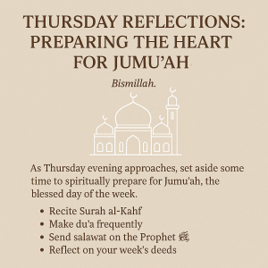 As Thursday quietly settles in, we find ourselves approaching a divinely appointed rhythm in our week  the sacred day of Jumu’ah (Friday). For Muslims around the world, Thursday evening is more than just the end of a workday  it’s the beginning of sacred preparation, a time to spiritually warm the heart and awaken the soul before standing under the mercy of Friday.