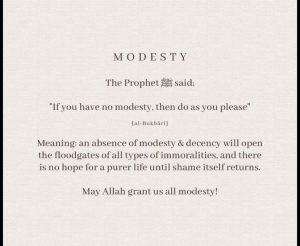 `Abdullah ibn Maslamah (RA) narrated that the Prophet ﷺ said: “Modesty is part of the teachings of the earlier prophets. Whoever lacks modesty is free to do as he pleases.” Similarly, Zayd ibn Talya (RA) reported that the Prophet ﷺ said: “Every religion has a distinct characteristic, and the characteristic of Islam is modesty.”