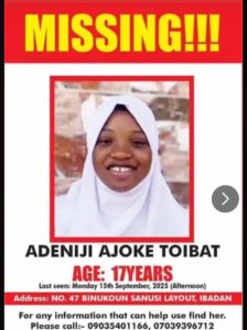 According to relatives, Ajoke was last seen on the afternoon of Monday, 15th September, 2025, at No. 47 Binukoun Sanusi Layout, Ibadan. Efforts to trace her whereabouts since then have been unsuccessful.